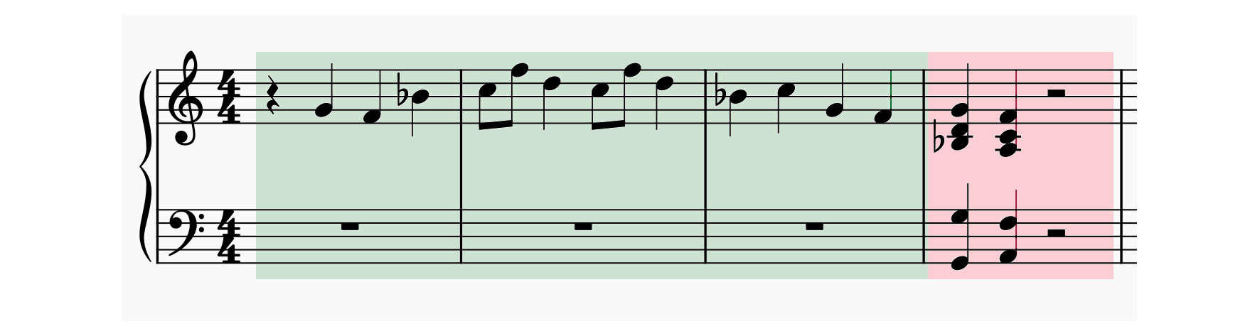 Fig. 7 Symbolic notation for the recorded audio sample. In green, the first six seconds with isolated notes, and in red, the second part, up to eight seconds, with chords.#